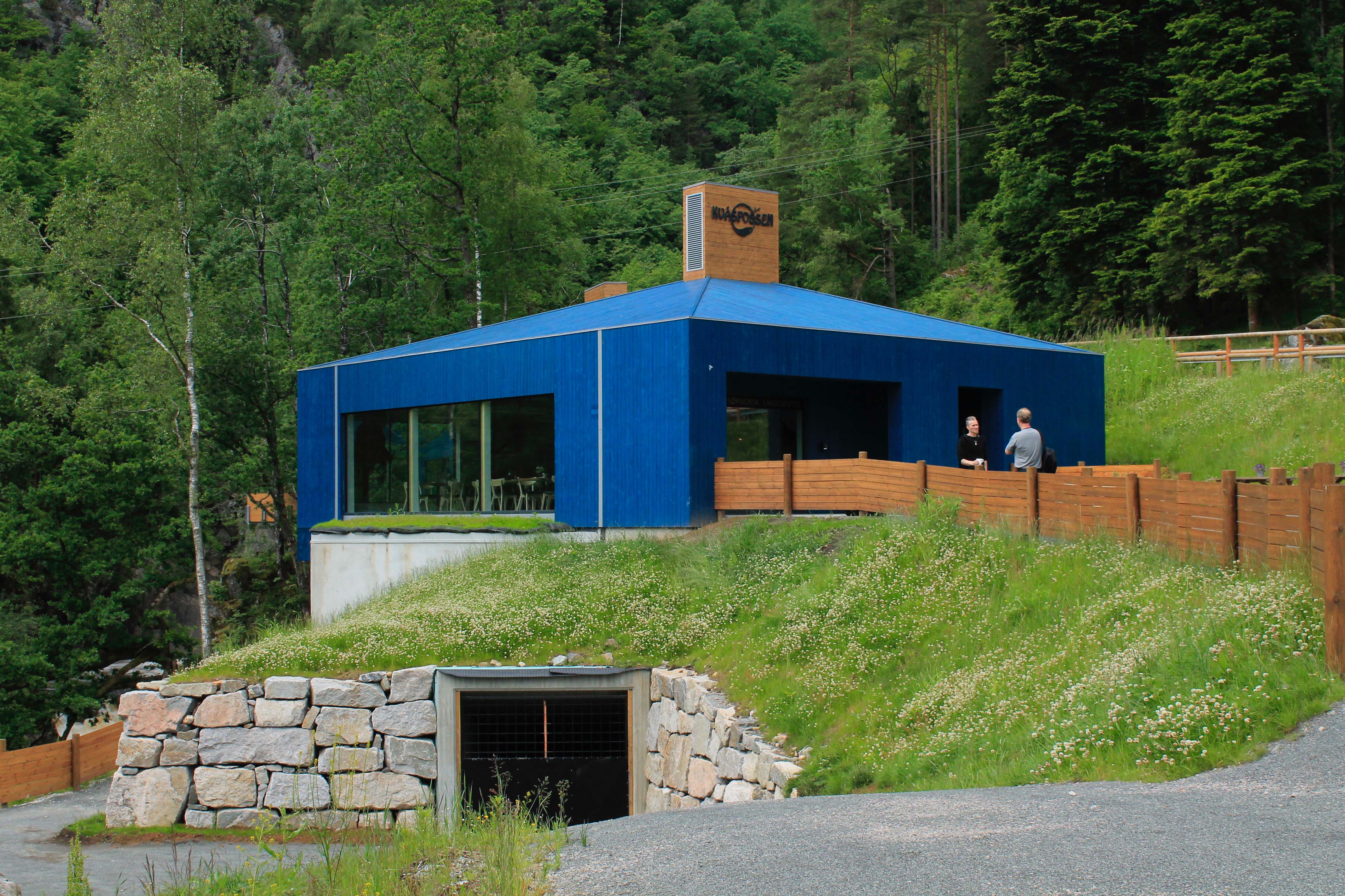 Lokalet ligger idyllisk til like nedenfor den flotte Kvåsfossen, helt på kanten av det 15 meter dype juvet. Store fasadevinduer skaper en fantastisk nærhet til naturen og til elva Lygna. Senteres lokaler ligger ovenpå selve laksetrappa.