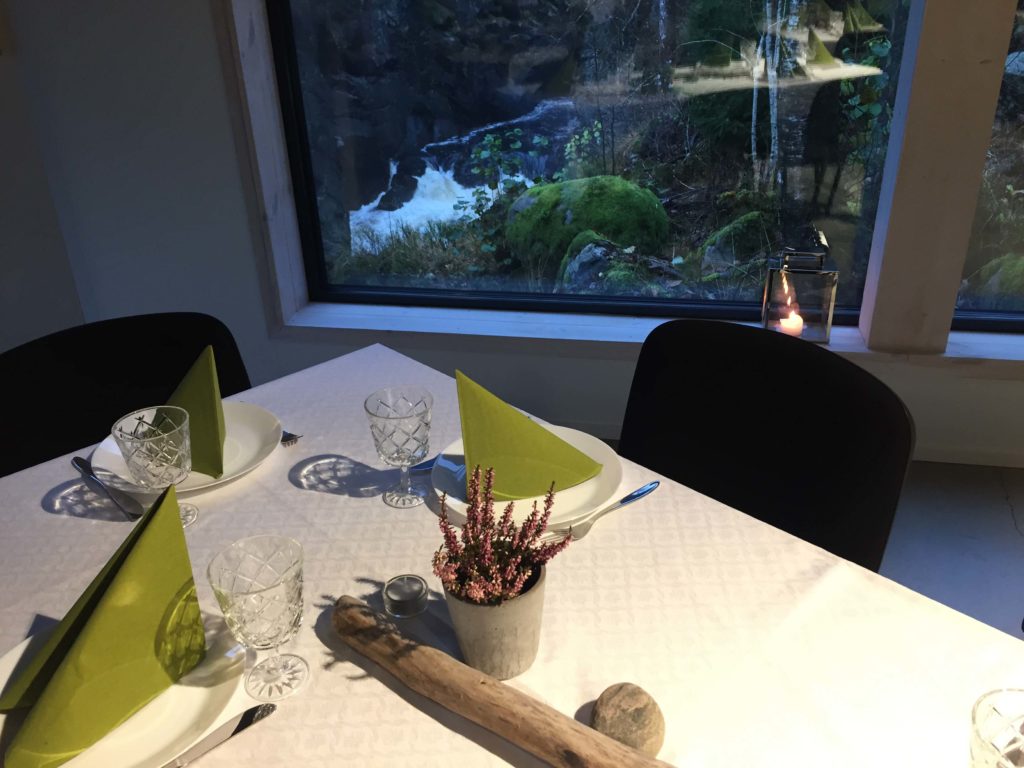 Lokalet ligger idyllisk til like nedenfor den flotte Kvåsfossen, helt på kanten av det 15 meter dype juvet. Store fasadevinduer skaper en fantastisk nærhet til naturen og til elva Lygna. Senteres lokaler ligger ovenpå selve laksetrappa.
